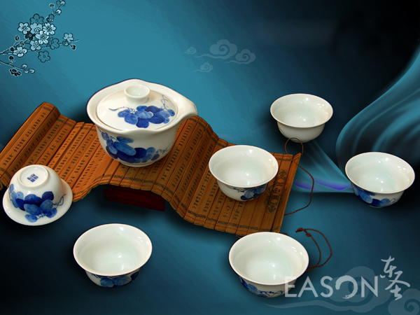 本套手绘釉下彩花鸟茶具图案风雅,器型精致,画功精湛,瓷质上佳!徐徐斟出的一杯好茶,您将体味到茶道的真谛!
