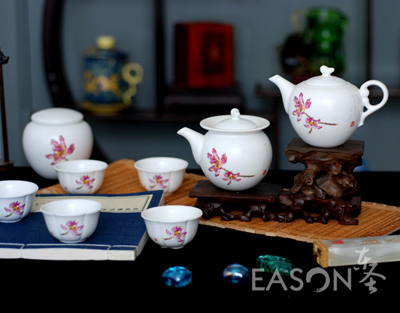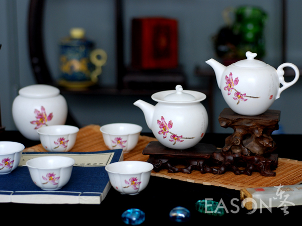 本套茶具套装采用高温窑变,同时巧妙的溶入了亚光磨砂釉,使作品典雅高贵;另外,作品运用浮雕构图,形象副真,色彩艳丽,是近年来陶瓷艺术的有一个巅峰之作。