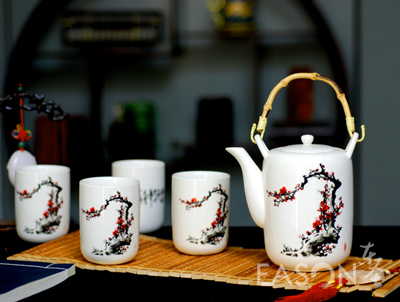造型很古雅的茶具组,杯壁与壶壁上绘着素雅的碎花纹图案,非常漂亮.壶柄用天然竹木作就,流线型的茶壶,绝对物超所值。