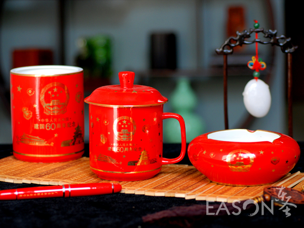 【特别说明】 建国60周年纪念品,三件套含将军盖杯、笔筒、烟缸,精美礼盒包装,是建国60周年特别制作的纪念品,极具实用 欣赏与馈赠。