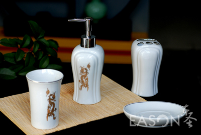 优雅华贵的居室当然需要高品质的饰品来装点!这套大气而高贵的卫浴套装采用中西结合的方式,充满了艺术韵味,符合人性化设计,手感细腻、光滑,既非常实用又可作为时尚家居装饰的点睛之处,尽显主人的品位。 它由洗手液瓶、牙刷座、牙膏筒、香皂座四件组成,给你的时尚家居带来高端品质。个人护理,是家居生活一个难以忽略的部分。对于成年人来说,一套得体而实用的个人护理用品是生活细节与品味自然流露;对于孩子来说,一套明艳快乐的个人护理用品,则是他培养良好个人卫生习惯的起点。